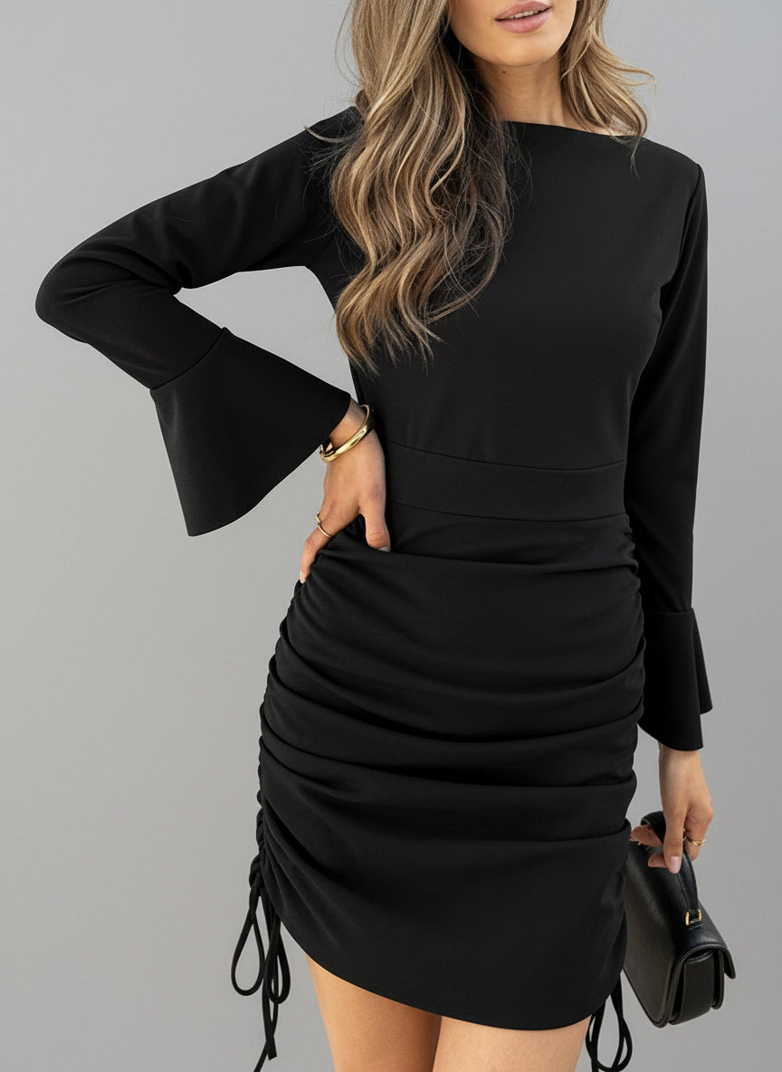 This elegant black dress is designed for moments when you want to look extra polished without sacrificing comfort. The bodycon fit subtly highlights the feminine shape, while the ruched, irregular skirt adds a playful and modern touch. The long sleeves with flared cuffs create a stylish, timeless look that’s perfect for autumn and winter.